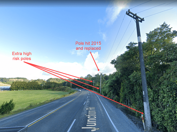 Using a combination of Waka Kotahi crash data from 1980 to now, layered with Powerco’s power pole location data, the tool identifies: