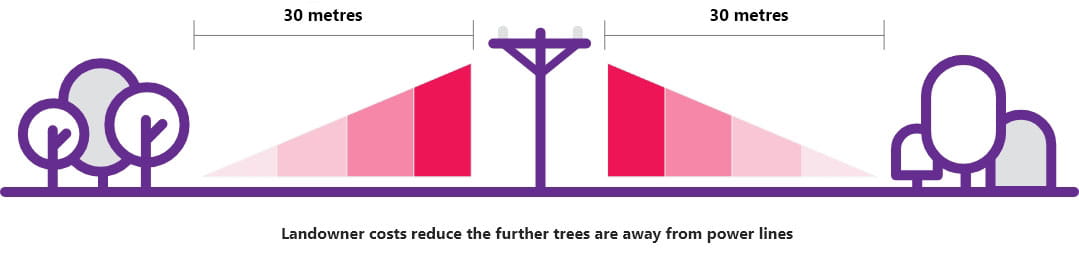 Landowners are legally required to make sure trees are a safe distance away from overhead lines and we recommend new trees are planted at least 30m away from power lines. This ensures adequate clearance around power lines for fallen branches and trees and keeps tree cutting costs down.