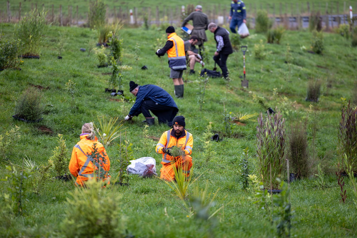 Over the past three years, we’ve been actively involved in tree planting to support these environmental goals. In 2022, nearly 100 locals, farmers, school kids, and representatives from organizations like South Waikato District Council, Downer, Farmlands, Fonterra, and Powerco teamed up to plant 4,500 trees in just two hours at Duxfield Reserve.